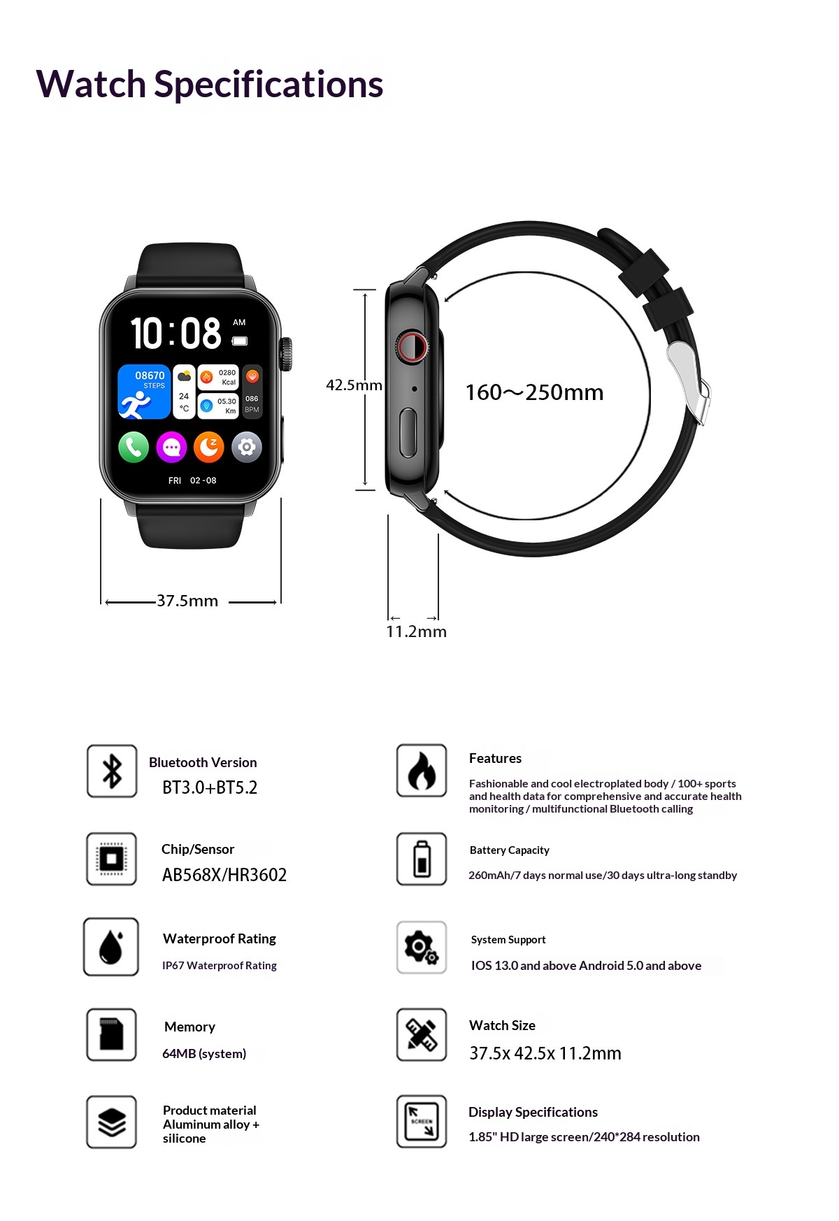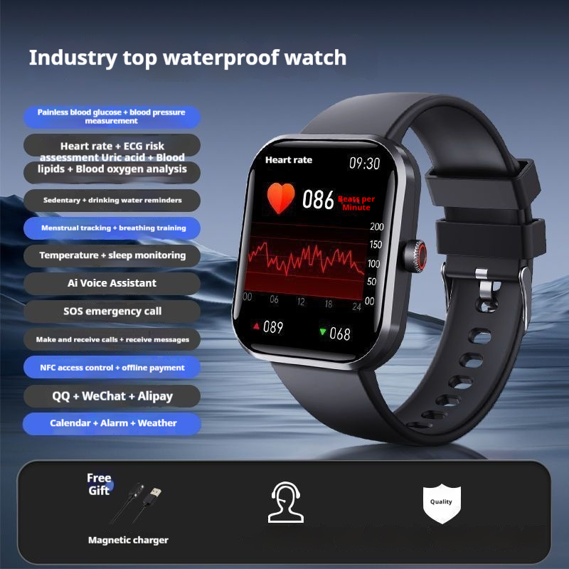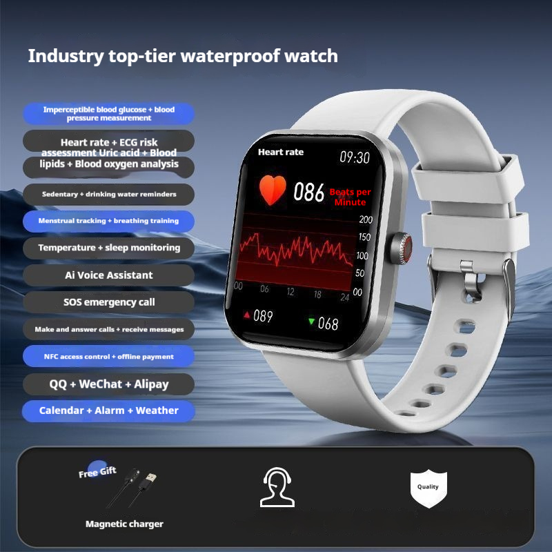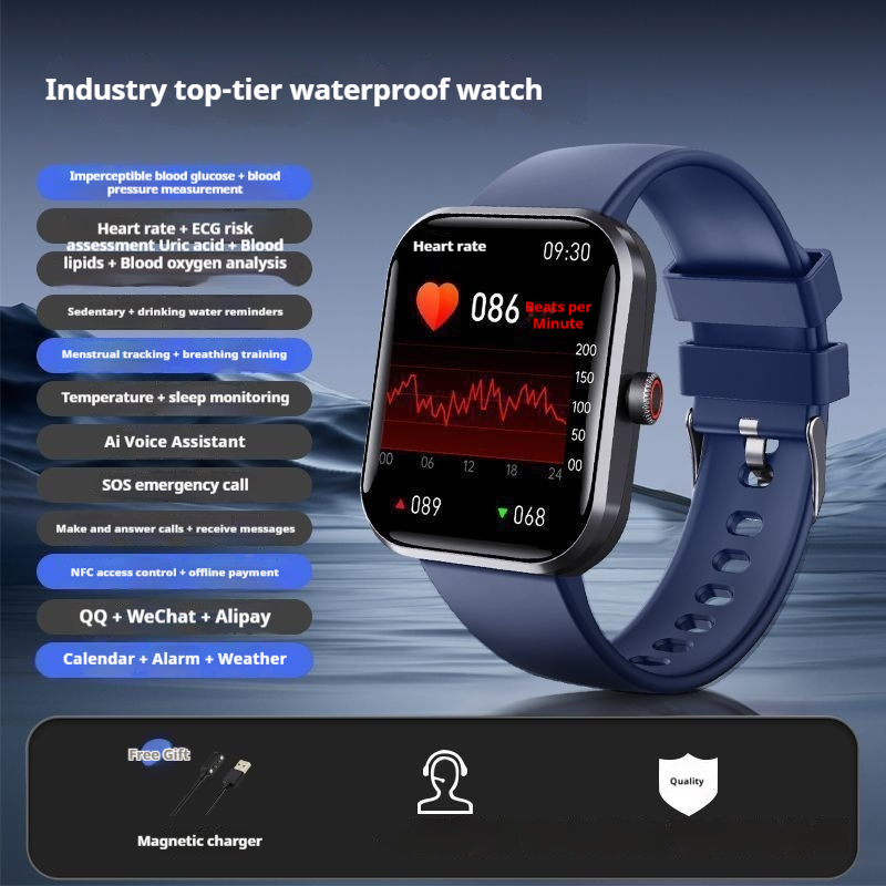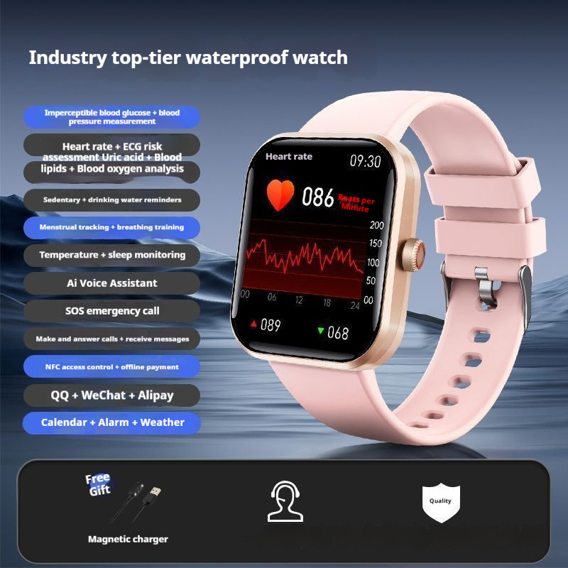 Features: Waterproof, Photography, Step Counting, Heart Rate Monitoring, Blood Pressure Measurement, Social Entertainment, Temperature Measurement, Bluetooth Call, NFC Function, Smart Reminder, Remote Selfie, Sleep Monitoring, Blood Oxygen Detection